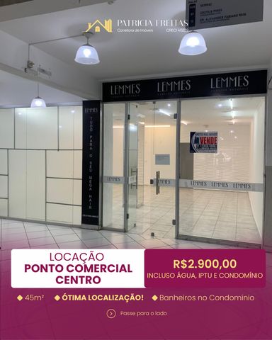 Ponto comercial disponível para locação em excelente localização no Centro, ideal para empresas, escritórios, lojas e atendimentos em geral. O imóvel possui 45m², ambiente amplo e boa apresentação comercial, sendo uma ótima oportunidade para quem busca praticidade e visibilidade em uma região central. O condomínio conta com banheiros de uso comum. Valor da locação: R$ 2.900,00 Incluso água, IPTU e condomínio. Entre em contato para mais informações e agendamento de visita.